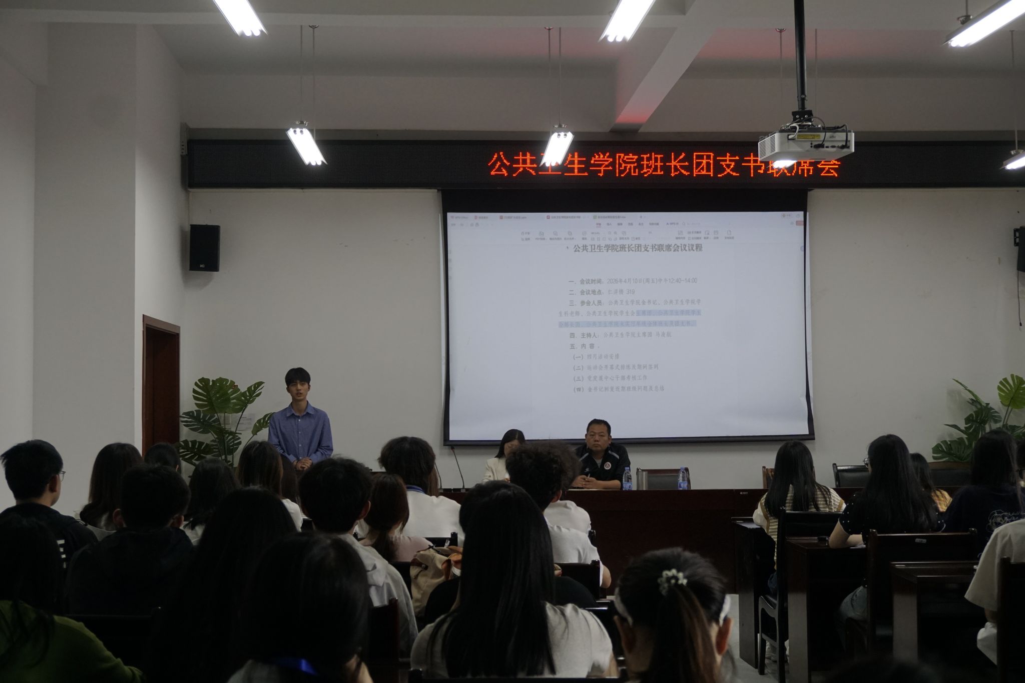 为明确四月工作重点,强化班团干部履职能力,搭建学院与班级的高效沟通桥梁,4月10日中午,公共卫生学院在仁济楼319会议室召开班长团支书联席会。本次会议特邀公共卫生学院党委副书记金川、学生科科长彭丽冰出席,公共卫生学院学生会主席团、部长团成员及未实习年级全体班长、团支书参会,会议由学生会主席团成员马浚航主持。