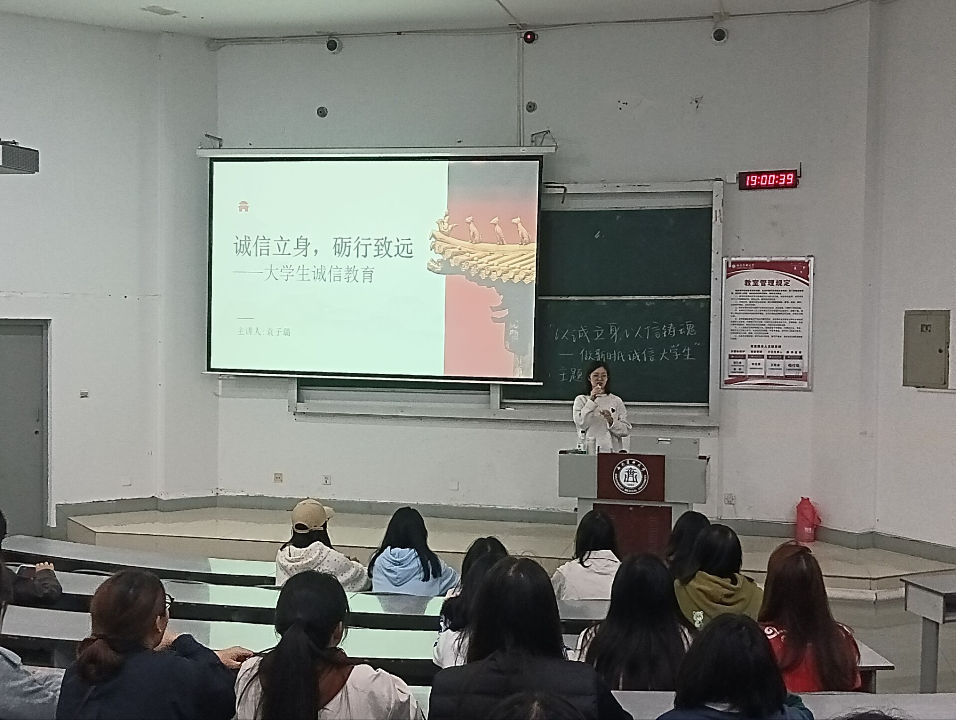 为引导同学们树立诚信意识,涵养诚信品格,争做新时代合格大学生,11月3日晚,公共卫生学院在明理楼105教室举办了“以诚立身,以信铸魂”主题活动讲座。讲座由学生科辅导员袁子璐主讲,学院共一百余位同学参加。