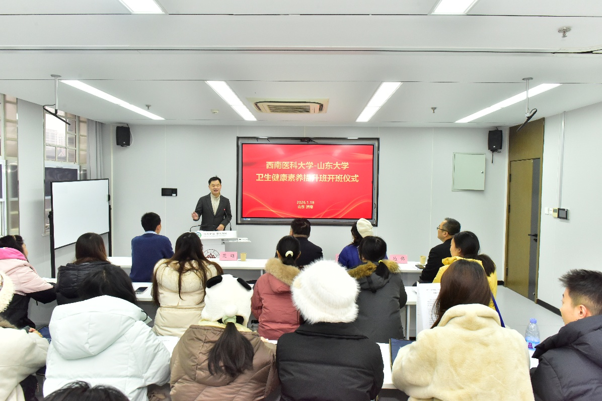 为深化校际合作,推动公共卫生人才培养与学科共建,2026年1月18日上午,西南医科大学赴山东大学寒假研学项目开班仪式在山东大学趵突泉校区综合楼实训室举行。仪式由山东大学公共卫生学院副院长马伟教授主持。