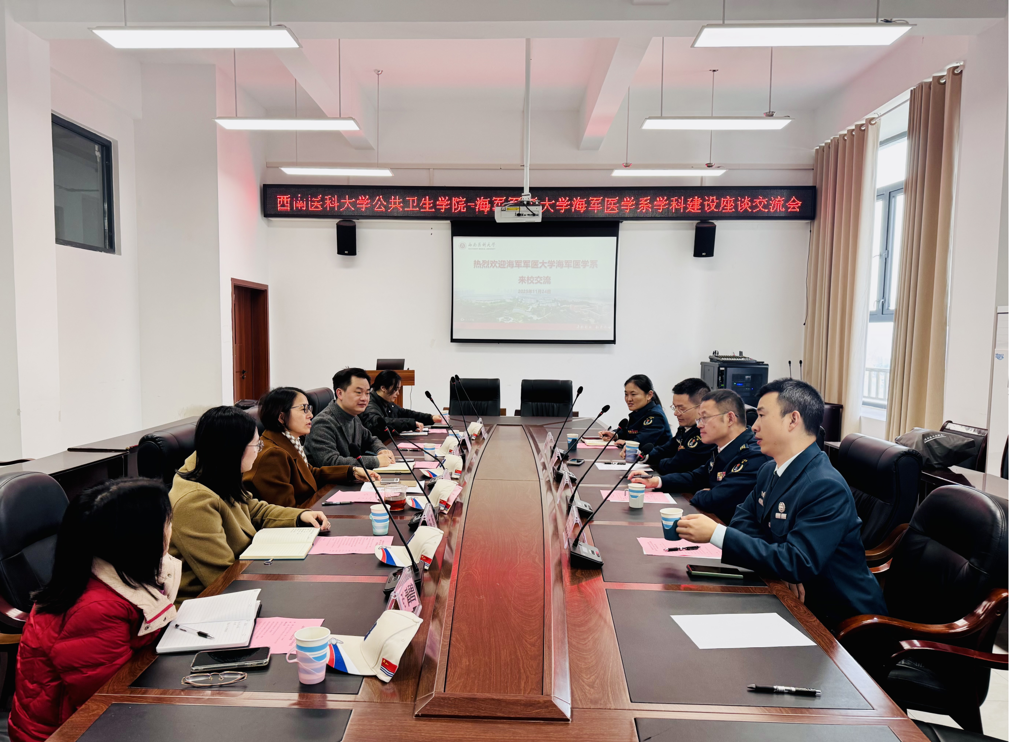 2025年11月24日下午,西南医科大学公共卫生学院与海军军医大学海军医学系学科建设座谈交流会在城北校区仁济楼334会议室顺利举行。双方围绕学科建设、人才培养、科研合作等议题展开深入交流,共谋公共卫生与海军医学融合发展新路径。