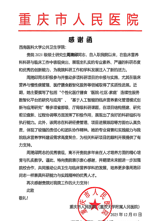 近日,重庆市人民医院向公共卫生学院发来感谢函,高度赞扬我院2021级硕士研究生周滟邱同志在该院临床营养科科研与临床工作中的突出表现,并对我院人才培养工作给予充分肯定。