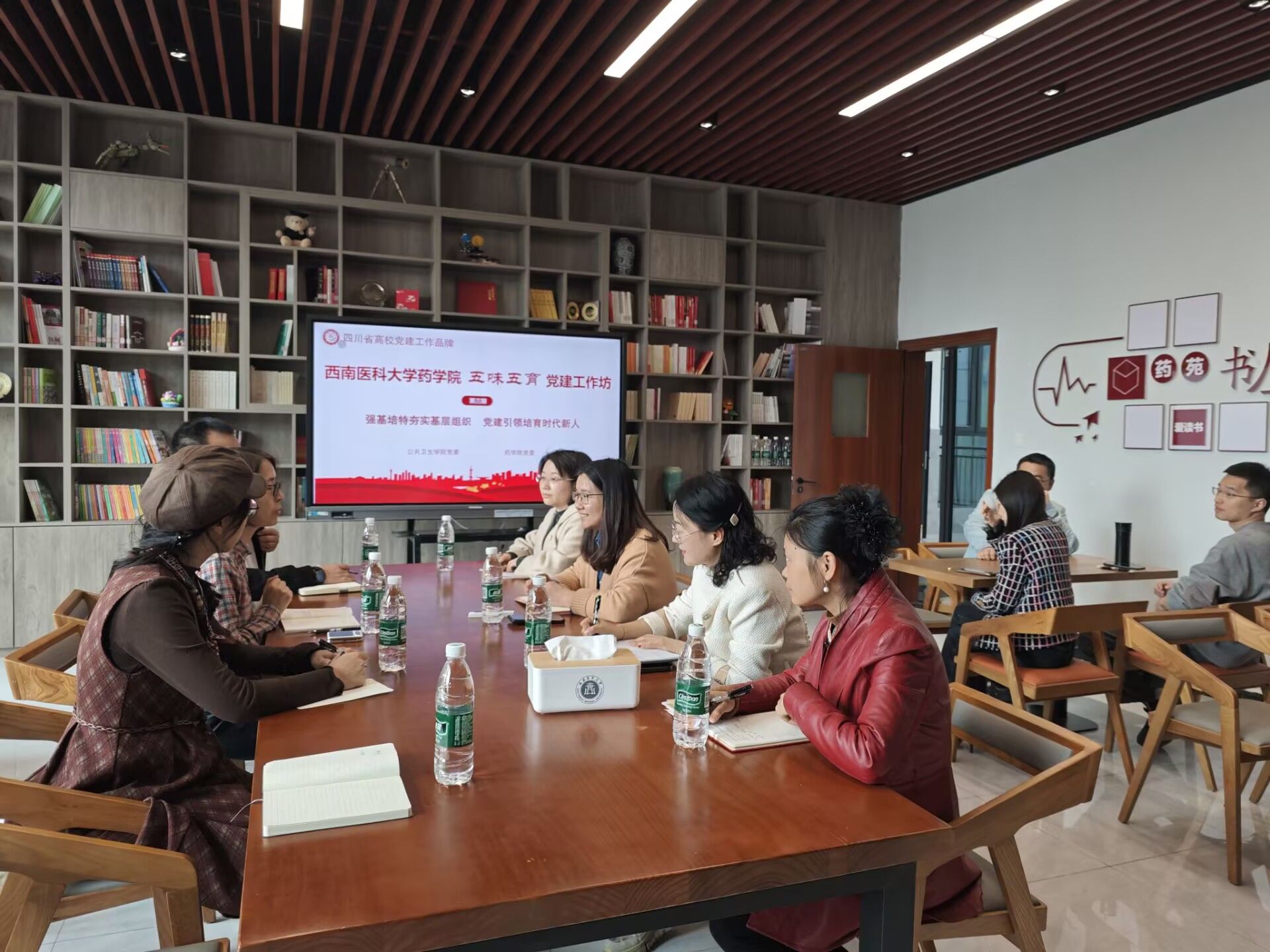 座谈会后,公共卫生学院一行实地参观了"五味五育"党建工作坊的功能分区,包括党员活动室、党建文化长廊、中药标本展示区等特色空间,详细了解了工作坊的日常运行机制和活动开展情况。参观人员纷纷表示,此次学习开阔了视野、启发了思路,将结合公共卫生学科特点,进一步挖掘专业资源,打造具有公卫特色的党建工作品牌。