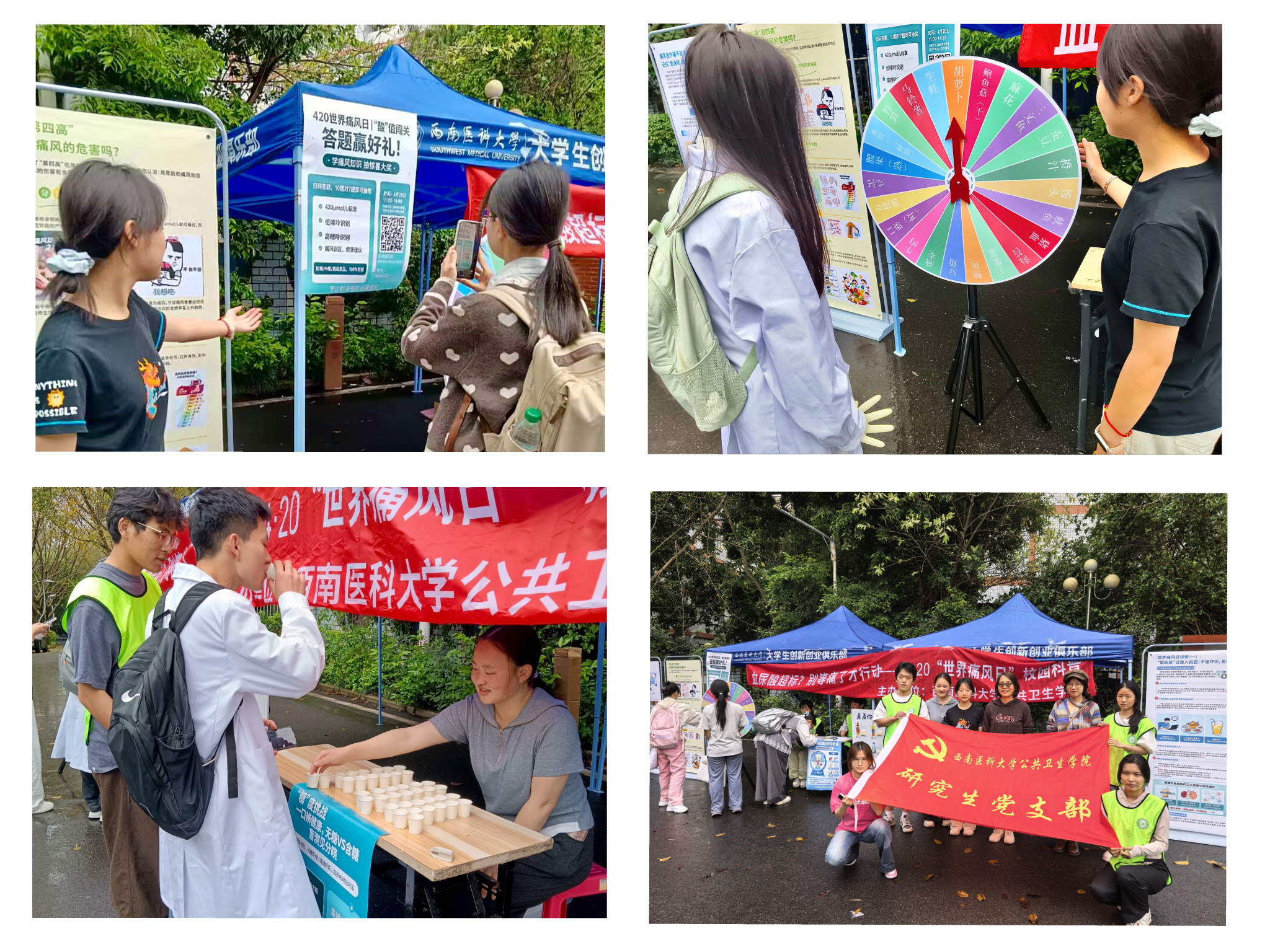 为提升大学生对高尿酸血症与痛风的认知,引导青年养成健康生活方式,2026年4月20日上午11时至下午2时,西南医科大学公共卫生学院在桂香苑门口顺利举办了“4·20世界痛风日”大学生健康宣传系列科普活动。